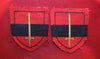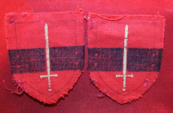Printed. Both thin red felt with black centre bar and inner border with a yellow sword, detailed in black, shows having been sewn on with threads remaining, slight age darkening.