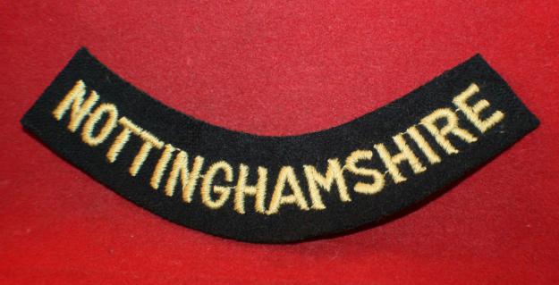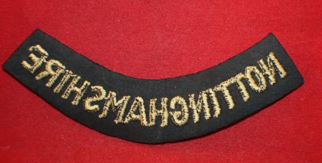 WW2 era, British Home Guard / Civil Defence NOTTINGHAMSHIRE Shoulder Patch. Yellow embroidered on black melton like material. Appears not worn.