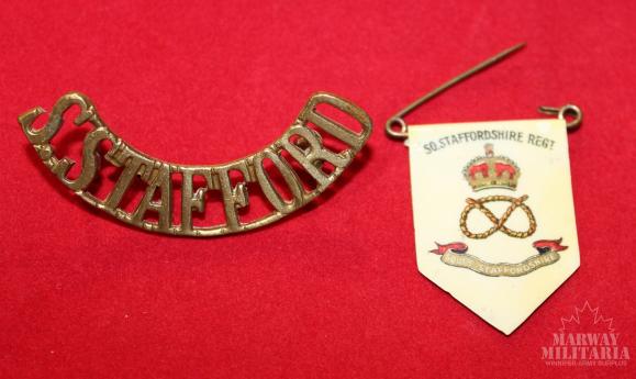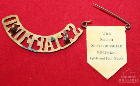 Lot of two. Title is made of brass, with lug fasteners. Saftery pin catch plastic SO STAFFORDSHIRE REGT tag. Nice grouping.