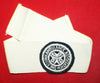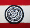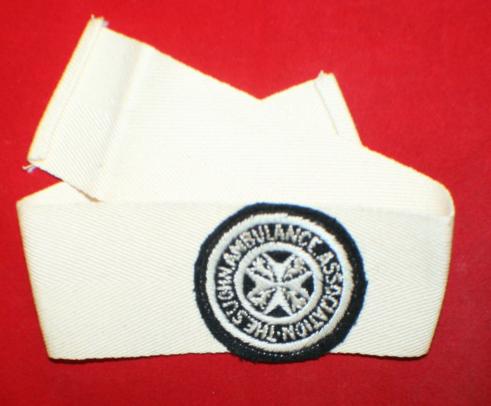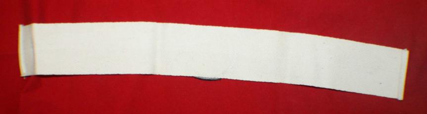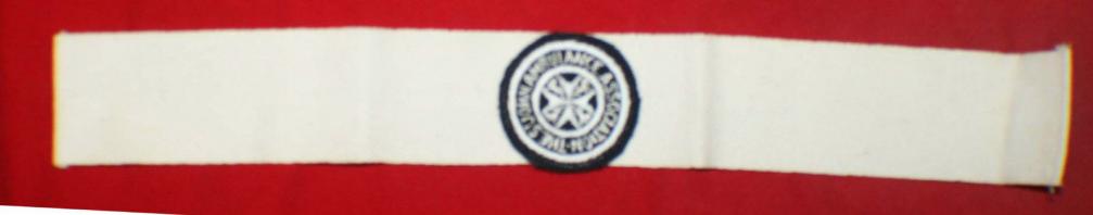 The St John Ambulance Association Arm Band - Early. Cloth patch (52mm tall) embroidered onto 50mm wide age toned white webbing like material. 15" long, folded. Previously worn but in very good condition.