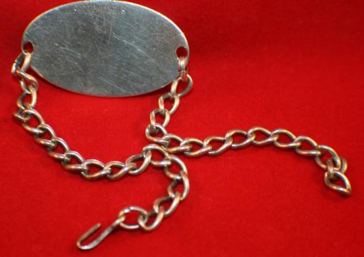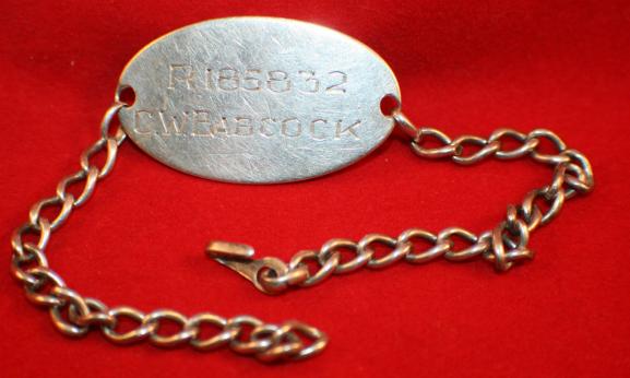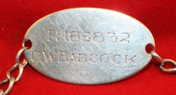 WW2, Oval ID Bracelet, 39mm wide, with words/numbers stamped, R185832 (R for other ranks) over C.W. BABCOCK, on one side and on other side, STERLING EC Co. Linked chain, 6 1/2"long with catch. Nice.