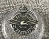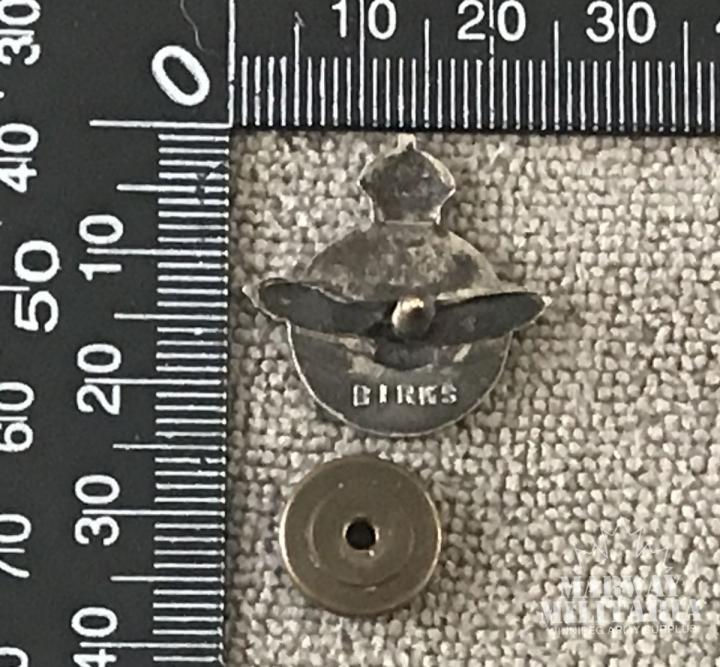 Silver/white metal, Kings Crown over Flying Eagle with words. R.C.A.F. RESERVE on circle banner, screw post fastener with nut. On back BIRKS.