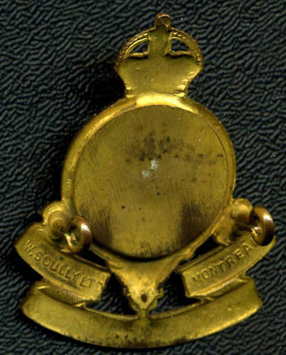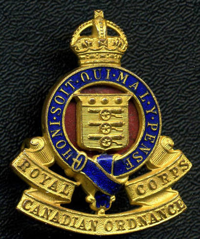 WW2 Royal Canadian Ordnance Corps Cap Badge -OFFICERS. Fire gilt Brass with blue and red enamels. With lug fasteners. SCULLY MONTREAL maker stamped. Nice stamping.