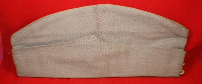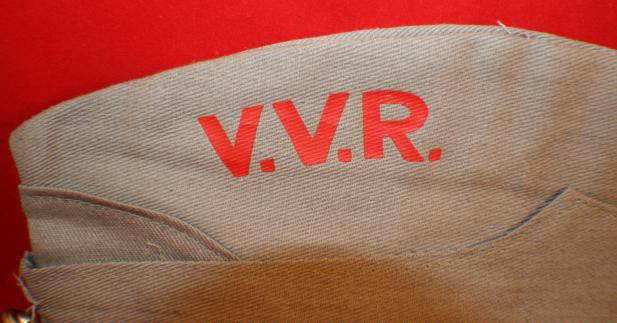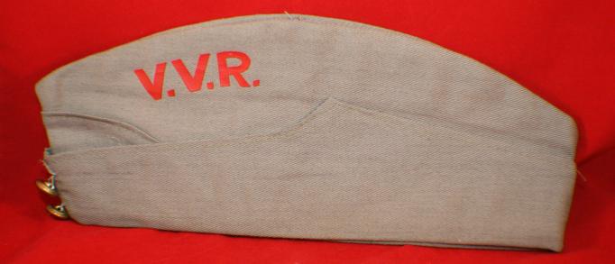 Canadian, WW2 era, V.V.R., Veterans Volunteer Reserve, Wedge Hat. Letter V.V.R., red flocking (painted) on a gray fine cotton material. Letters 3/4" high. Has two brass, Kings Crown over CANADA, in script letters, front buttons. Brown leather sweat band with a tag which has 6 7/8 and word PRICE on it. Lined with s light blue plaid type cloth. Shows wear and slight age dulling. Nice piece.